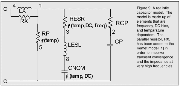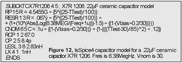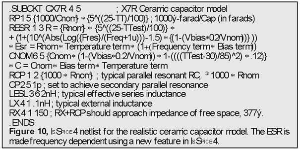 [1] provides further derivation of, and reasoning behind, the equations in Figure 10. It also provides equations for NP0, C0G, and Y5V capacitor families. SPICE models were not provided in [1] due to syntactical issues. The new ISSPICE4 B element alleviates these roadblocks. Several models for the X7R, C0G, and NP0 families of capacitors are available on the Intusoft Web site with the complete SPICE offering on the newsletter subscribers disk. In the next Intusoft Newsletter we will derive a realistic model for a tantalum capacitor.