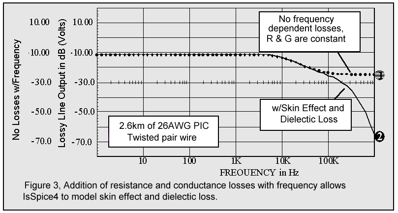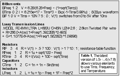 Figure 3 shows a simulation of the new lossy line model with and without frequency dependence in the resistor and conductance model parameters. The actual model statement is shown in Table 1. The frequency dependence adds skin effect and dielectric loss to the model. In order to further illustrate B element usage, two other articles on modeling MOVs and capacitors are provided in this newsletter.