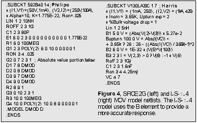 A varistor functions as a nonlinear variable impedance. Its response can be approximated by the function I = KVa, as explained in [2, 3], where a represents the degree of nonlinearity. While this function can be modeled with SPICE 2G polynomials, unnecessary complexity results even for linear values of a. With the ISSPICE4 B element, we can reduce the complexity while allowing more accurate control of a..