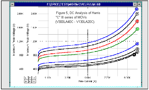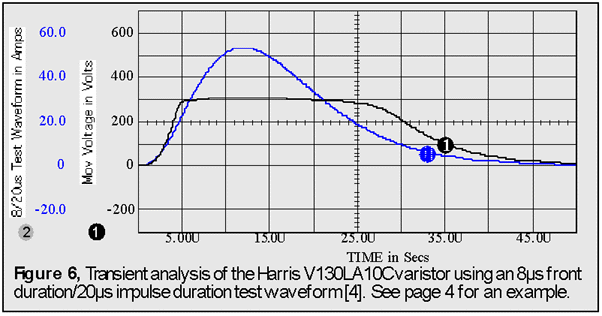 The graph in Figure 5 shows the nonlinear V-I response for several Harris MOVs, while Figure 6 shows the transient response to a 8/20us test waveform. Test waveshapes repre- sentative of surge voltages are available directly out of the ICAP/4 stimulus libraries; no development is required [4].