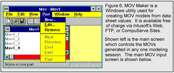In order to ease the conversion of varistor data sheet param- eters into ISSPICE4 models, a software utility was created. To model a new part, you simply fill out the screen shown in Figure 7. Several models can be generated and edited in the same session. On-line help is provided to assist you in filing out the data screen and for reference material. Once completed, the models can be saved in an ASCII library file. The Windows program, MOVMaker.EXE, is available FREE of charge via Intusofts Web, FTP, or CompuServe sites. Over 200 models for Philips and Harris MOVs are included on the newsletter floppy disk for subscribers. On a related note, simulation of spark gaps devices will be covered in a future issue.