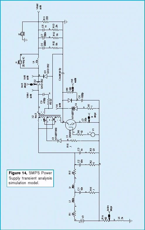 Noise is coupled into the circuit through the stray capacitance between the switching transistor and its heat sink and through the inter-winding capacitance of the forward converters transformer. In order to measure the noise, we will use a forward converter design that isbeing prepared for a future article featuring a complete power supply design using our Power Supply Designer package. The transient analysis model for the power supply is shown in Figure 14.