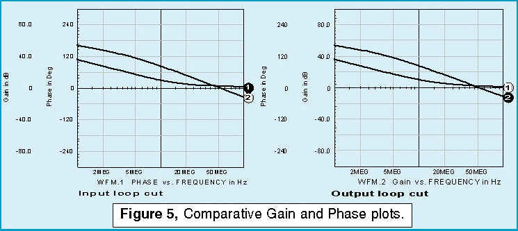 A loop cut is made by inserting a series AC source and identifying Vout as the input side of the source and Vin as the output side. Input and output are identified as the signal flow direction. If you reverse them, the gain and phase going backwards will indicate that they should be reversed. Making loop cuts in this manner allows the simulator to solve the DC operating points without concern for AC stability, basically performing the open loop analysis on a closed loop circuit. The technique works much better in a computer simulation than for real hardware, because the circuit can still be observed when its unstable. Figure 3 shows the gain and phase, along with the intrinsic loop configuration. |